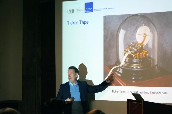 Prof. Dr. Ryan Riordan hielt einen Vortrag über „Technology in Finance - Millisesconds, Markets and Minds: Past, Presence, Future” und beleuchtete die Informationsübertragung der Vergangenheit bis in die heutige Zeit und stellte sie in Kohärenz zur Entwicklung des Finanzmarktes. Dabei stellte er die Frage nach der Wertigkeit zukünftigen Tradens.